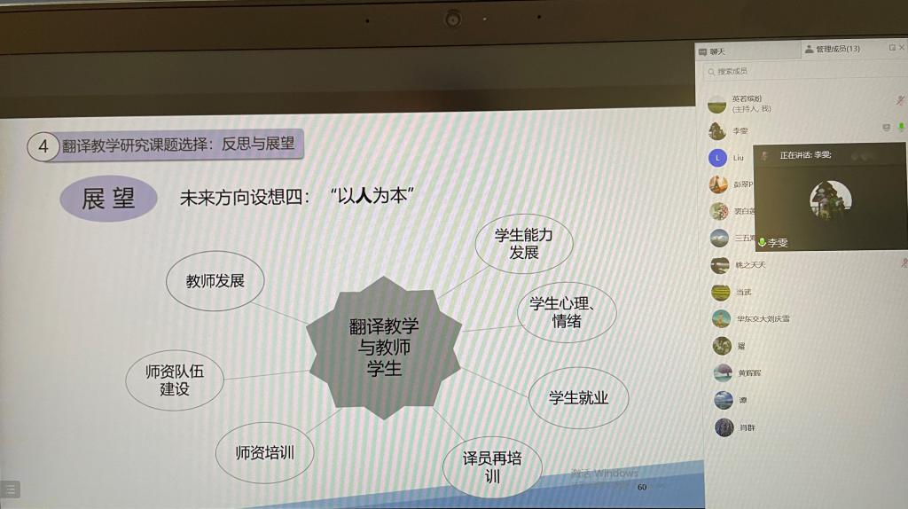 翻译系主任李雯老师在线为翻译研究所老师们分享了翻译教学研究如何选题。本次学术沙龙由翻译研究所所长陆秀英教授主持。