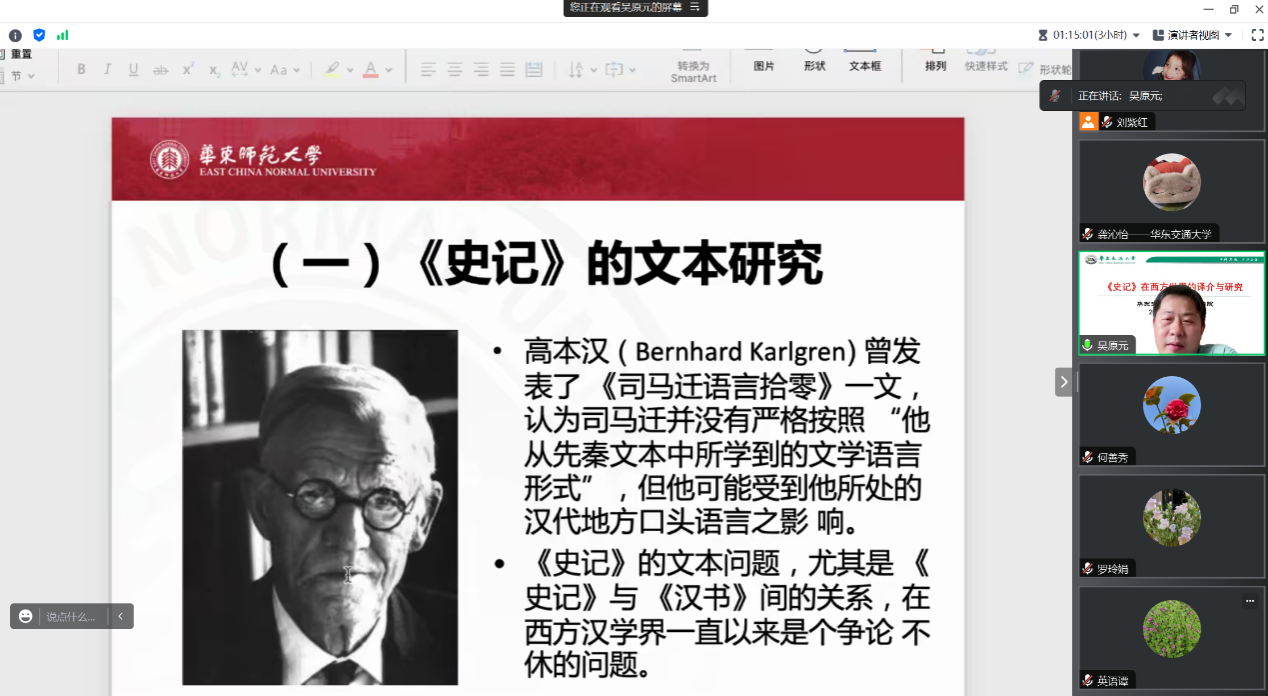 师生做了一场题为“《史记》在西方世界的译介与研究”的学术讲座,讲座由学院副院长陆秀英教授主持。讲座旨在全面梳理与介绍《史记》在西方世界的译介与研究,并就其译介方法及原因、《史记》在海外的新见解和新观点展开评析,以期展示中华传统文明的世界影响力之同时,揭示其世界性意义。