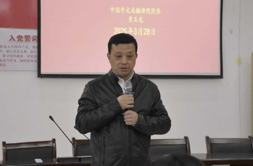 3月28日下午,中国外文局翻译院院长黄玉龙一行来校交流并做专题讲座。中国外文局翻译院院长黄玉龙、计财部二级巡视员杨青、办公室主任孟津,黑料正能量