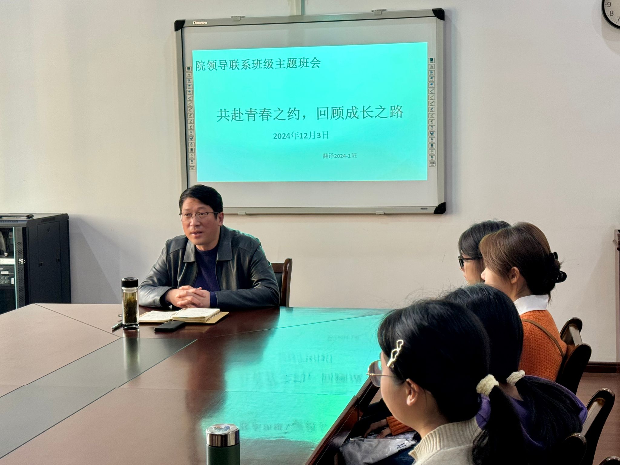 12月3日下午,翻译2024-1于学院楼308会议室开展了“共赴青春之约,回顾成长之路”主题班会。本次班会由班长吴姚主持,院党委副书记光辉、辅导员徐蒙蒙出席本次活动。