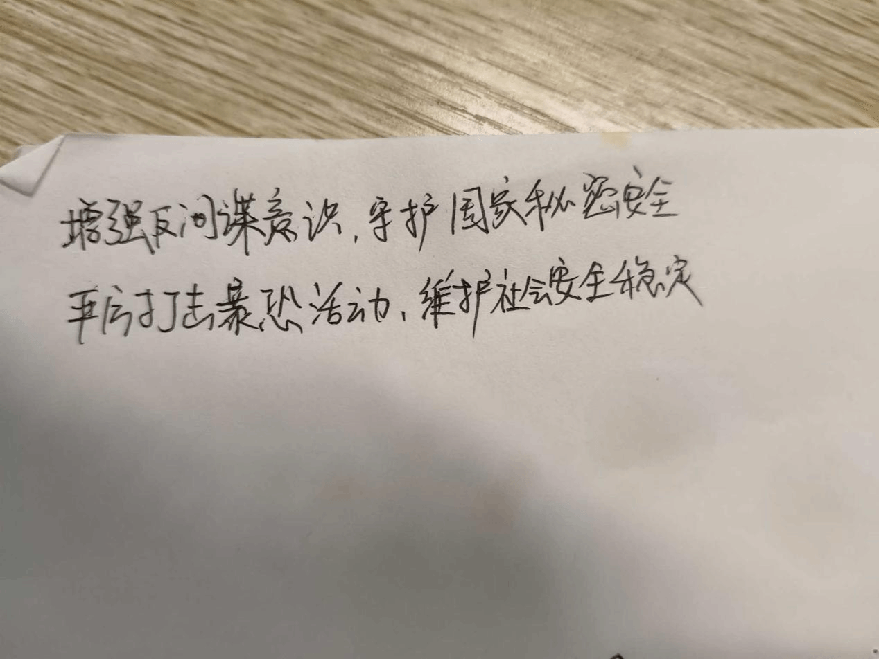 于2024年11月18日到11月24日举办了“反间谍安全防范,防范暴恐活动”系列的主题班会,并让学生书写了反间谍安全防范,防范暴恐活动的标语,使学生进一步认识到防范间谍活动和暴恐活动的重要性。
