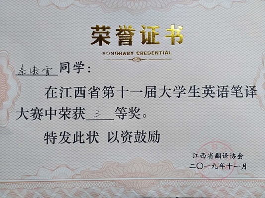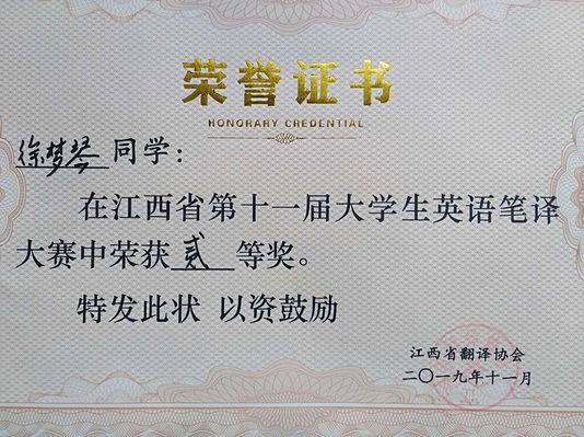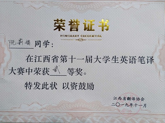 17级翻译硕士徐梦琴和16级翻译2班阮莉娟同学分别荣获二等奖,16级翻译1班秦傲雪同学荣获三等奖。