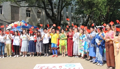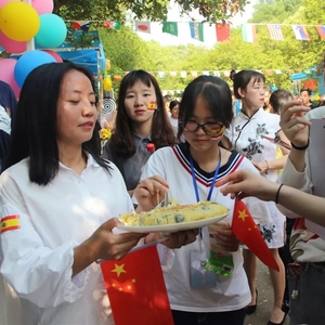 开幕式表演的“服装秀”和演唱歌曲《我和我的祖国》结束后,各班带来了他们特有的主题展示。广袖襦裙,衣袂翻飞,这是古色古香的汉服之美。英语(国际贸易)2018-3带来的精彩“汉服show”既体现了我国传统文化生生不息的活力,更呼应了“大美中国”的主题。弗朗明哥,斗牛披风,这是热情洋溢的西班牙之美。英语(英西复语)2018-1为大家准备了香醇的西班牙风味果酒和现烤的土豆饼,还有将西语和英语结合的“猜单词”游戏,别具一格地向大家展示了多彩的西班牙文化。除此之外,还有源远流长的戏曲之美、神秘原始南非之美……学思路上的“风景”,美不胜收。一份份美食、一个个游戏互动、一件件展品呈现各国风土人情,传递多样文化交织之美。