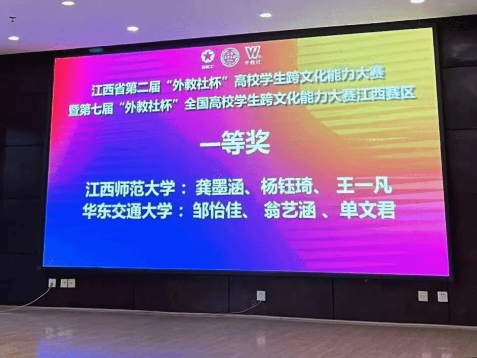 学生邹怡佳、翁艺涵、单文君在本次赛事上表现优秀,充分展现了专业的外语能力与演讲素养,荣获一等奖,排名高居全省第二,将代表江西省参加十一月份的国赛。