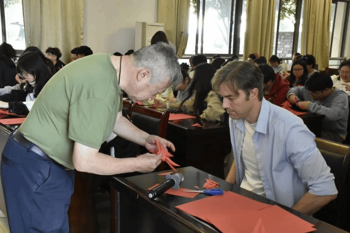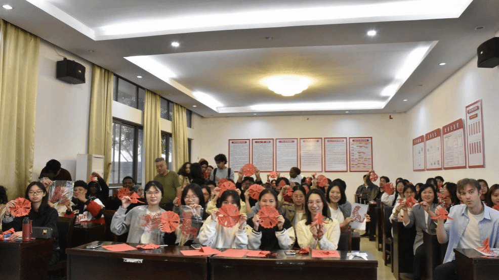 院长陆秀英出席活动,江西工艺美术学术专家、中华文化促进会剪纸艺术分会副会长、豫章剪纸第五代传承人沈玉谋主讲,2022级英语(国际贸易)专业学生和2024级留学生参加本次活动。活动由舒星老师主持。