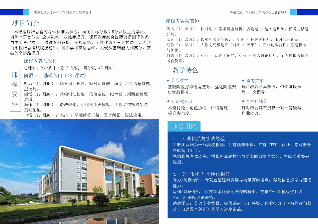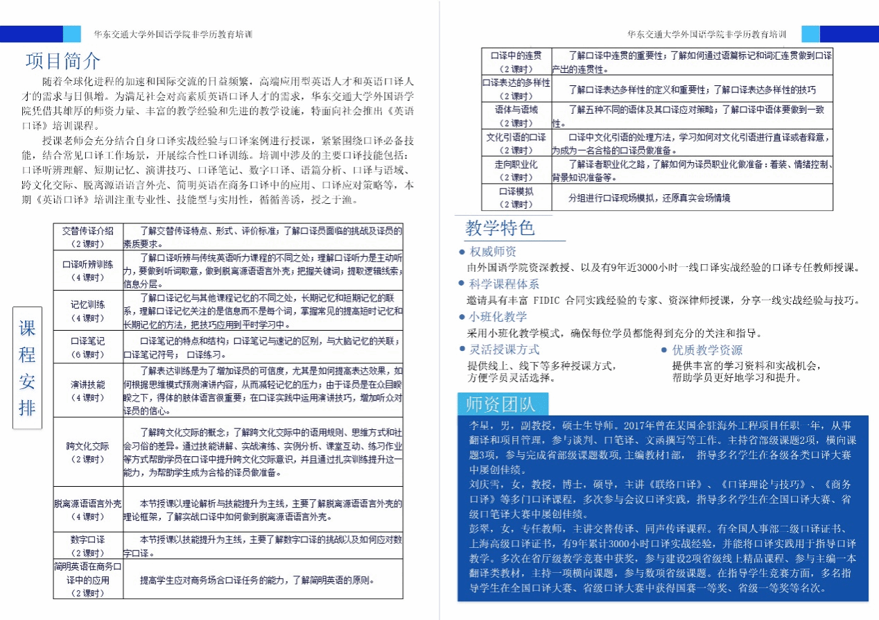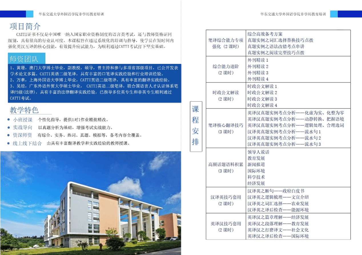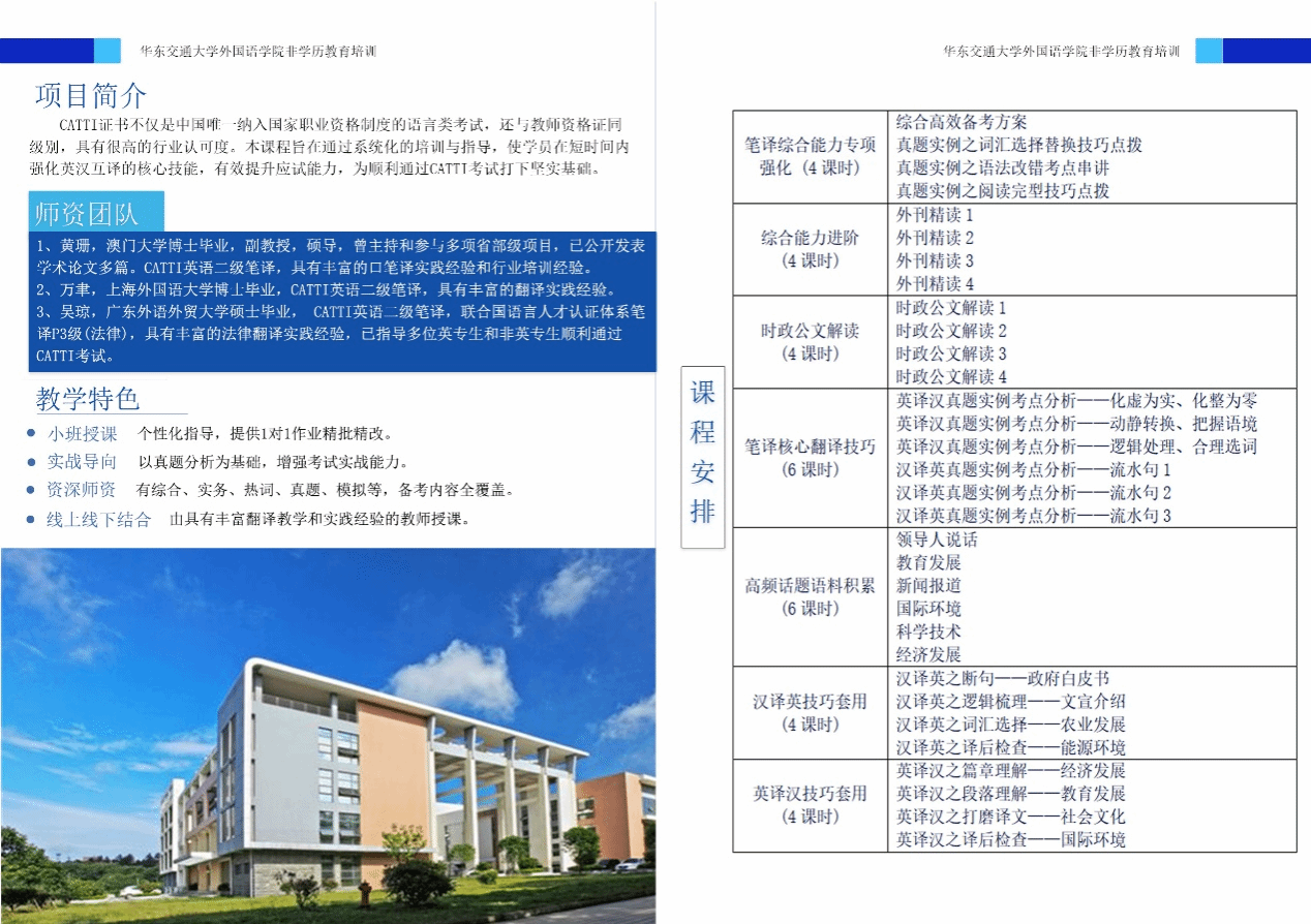 随着全球化进程的加速和国际交流的日益频繁,出国留学人员、高端应用型英语人才及英语口笔译人才的需求与日俱增。为满足社会对高素质英语人才的需求,黑料正能量 凭借其雄厚的师资力量、丰富的教学经验和先进的教学设施,特面向社会推出《雅思双阶全能冲刺班》、《CATTI二级笔译》、《CATTI三级笔译》及《英语口译》等培训课程。各课程项目简介、课程安排、教学特色及师资团队等详细信息见下图。