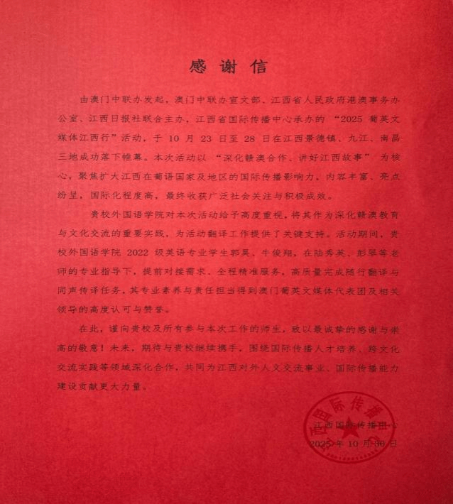 2025年10月23日至28日,由澳门中联办发起,澳门中联办宣文部、江西省人民政府港澳事务办公室、江西日报社联合主办,江西省国际传播中心承办的 “2025 葡英文媒体江西行”活动在江西景德镇、九江、南昌三地成功举办。活动围绕 “深化赣澳合作、讲好江西故事”,内容多样,受到广泛社会关注,扩大了江西在葡语国家及地区的国际传播影响。活动期间,黑料正能量