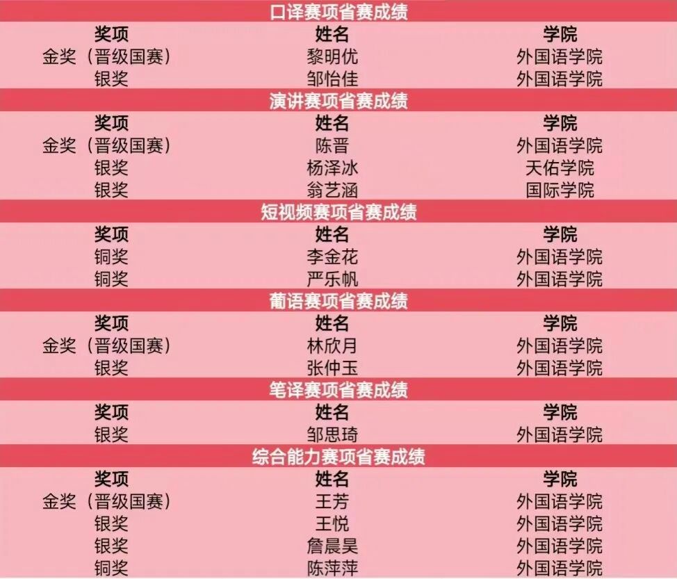 学子在此次大赛中凭借扎实的基础、优异的表现喜获佳绩,荣获金奖4项,银奖7项,铜奖3项。其中,参赛选手黎明优、陈晋、王芳、林欣月突出重围,分别在口译、演讲、综合能力、葡语四个赛项中斩获金奖,顺利晋级国赛。